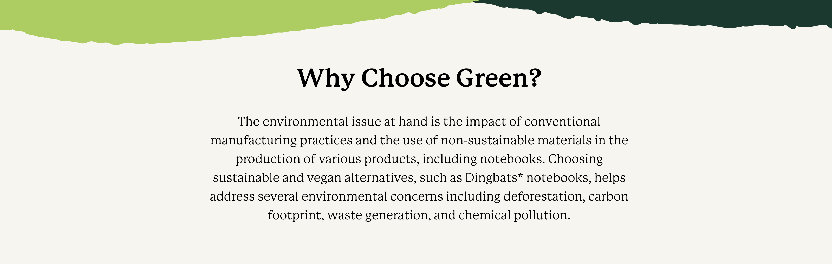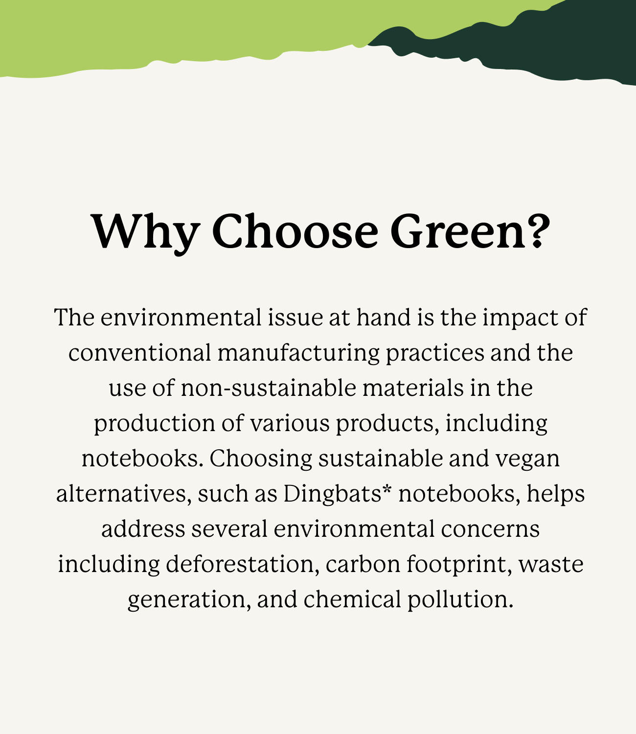 Our stylish faux leather covers are not just cute (though we say so ourselves), but non-toxic and fully degradable usually after 10 years. That is when the material is mixed in compost in controlled temperatures and environments. And the paper inside is just as green — your Dingbats* is made from trees that are replaced or allowed to regenerate naturally.