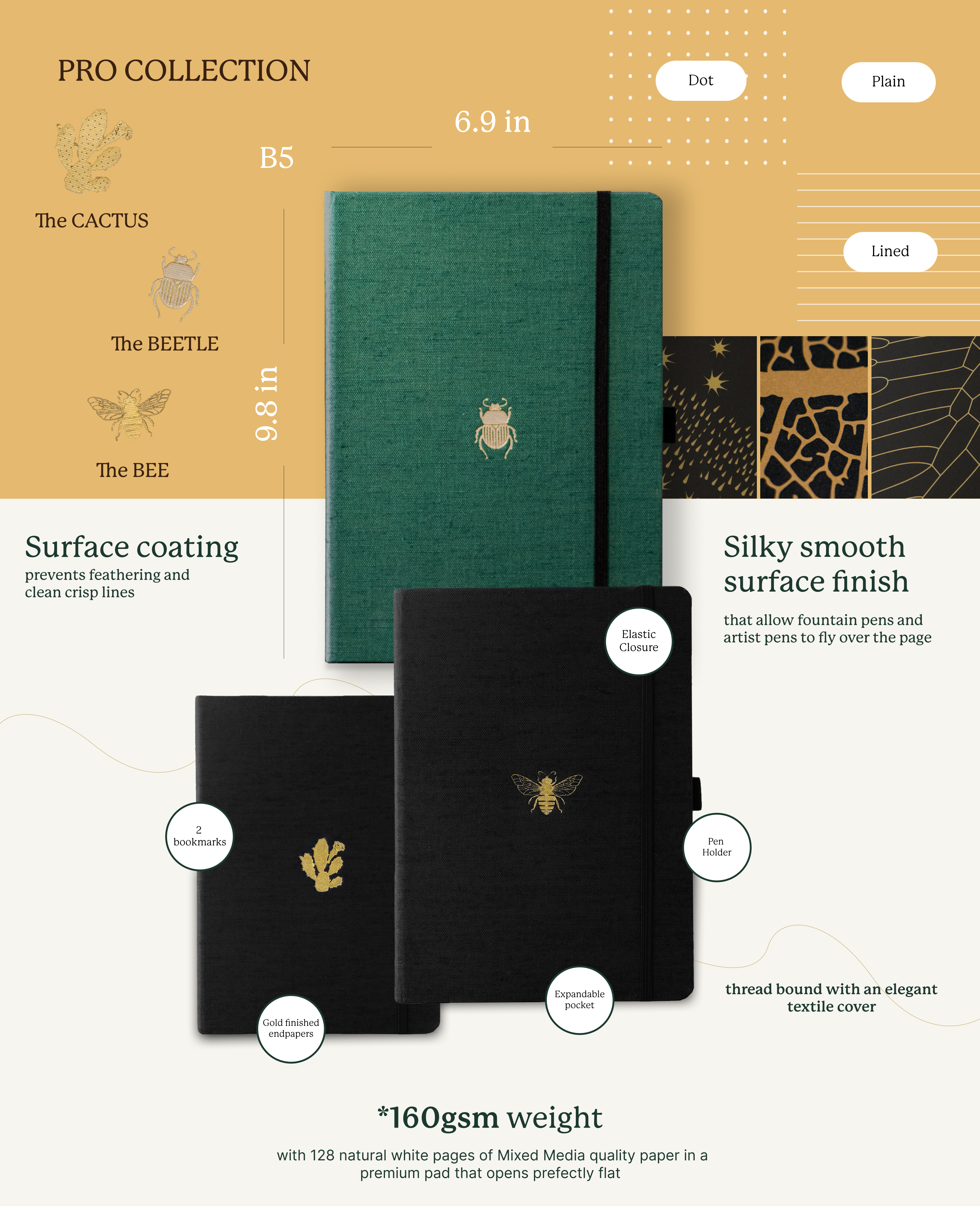 The Dingbats Pro Beetle Notebook is a powerful companion, meticulously crafted with top-quality 160gsm writing and art (or mixed media) paper. Its elegant deep green textile cover is made from 100% renewable resources. Inspired by the scarab beetle from Ancient Egyptian mythology (a timeless symbol of transformation and resilience), the notebook features a gold beetle motif embossed on the front cover, making it a purposeful tool for creativity and personal growth.